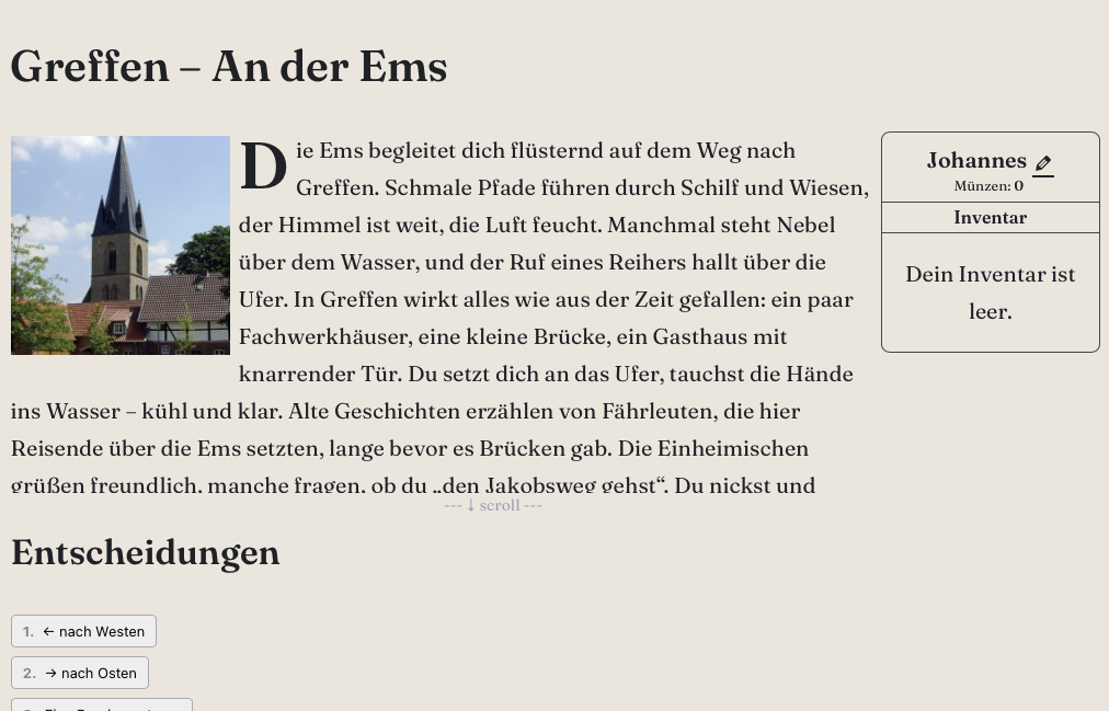 Mit Adventurebook (die technische Grundlage dieser Webseite) kannst du den berühmten Pilgerpfad digital erkunden, von Ort zu Ort wandern, historische Stätten entdecken und dich inspirieren lassen von der jahrhundertealten Geschichte des Pilgerns.